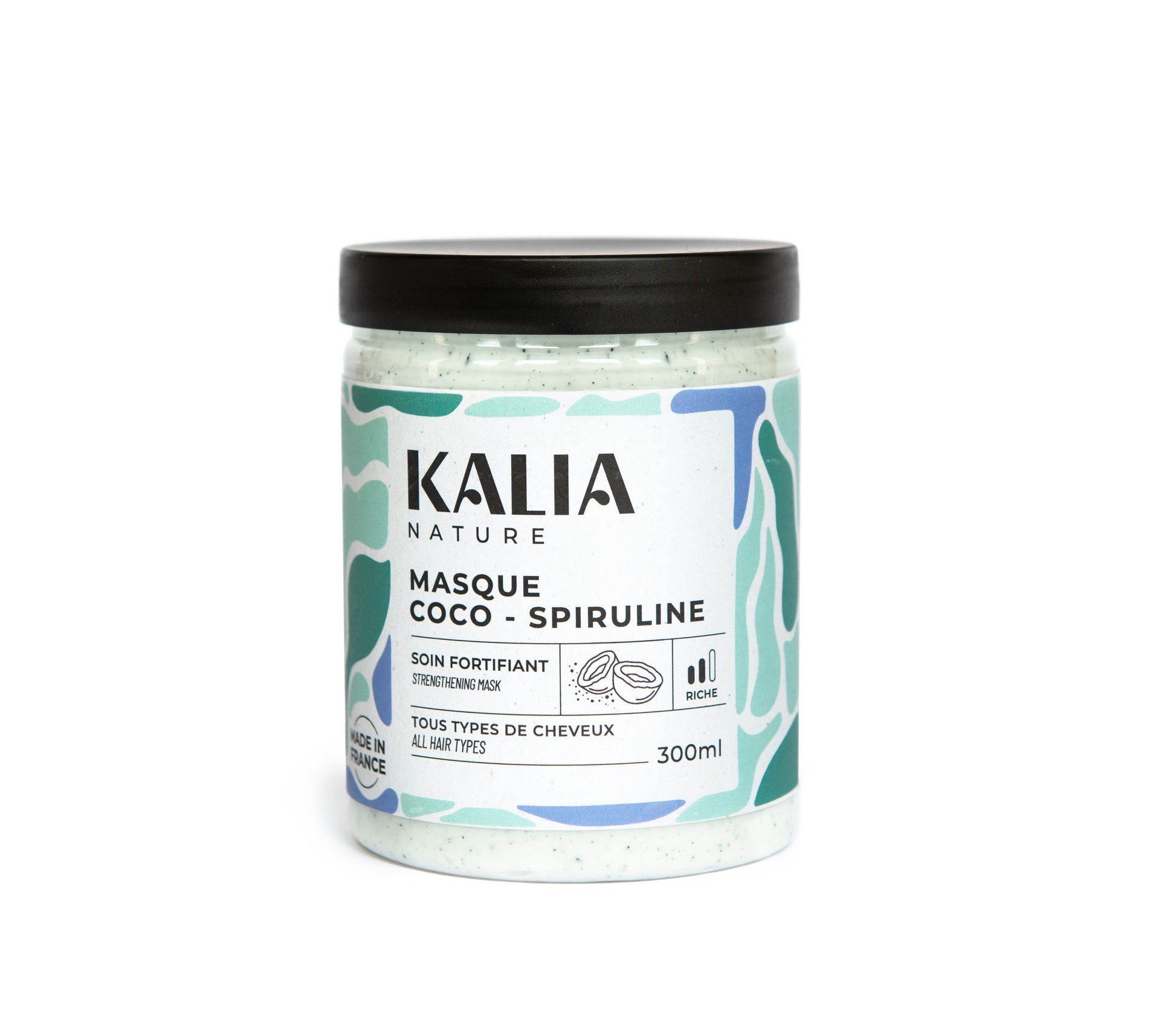 Soin protéiné, fortifiant et réparateur, le masque capillaire Coco-Spiruline de Kalia Nature apporte force aux cheveux bouclés, frisés, crépus.